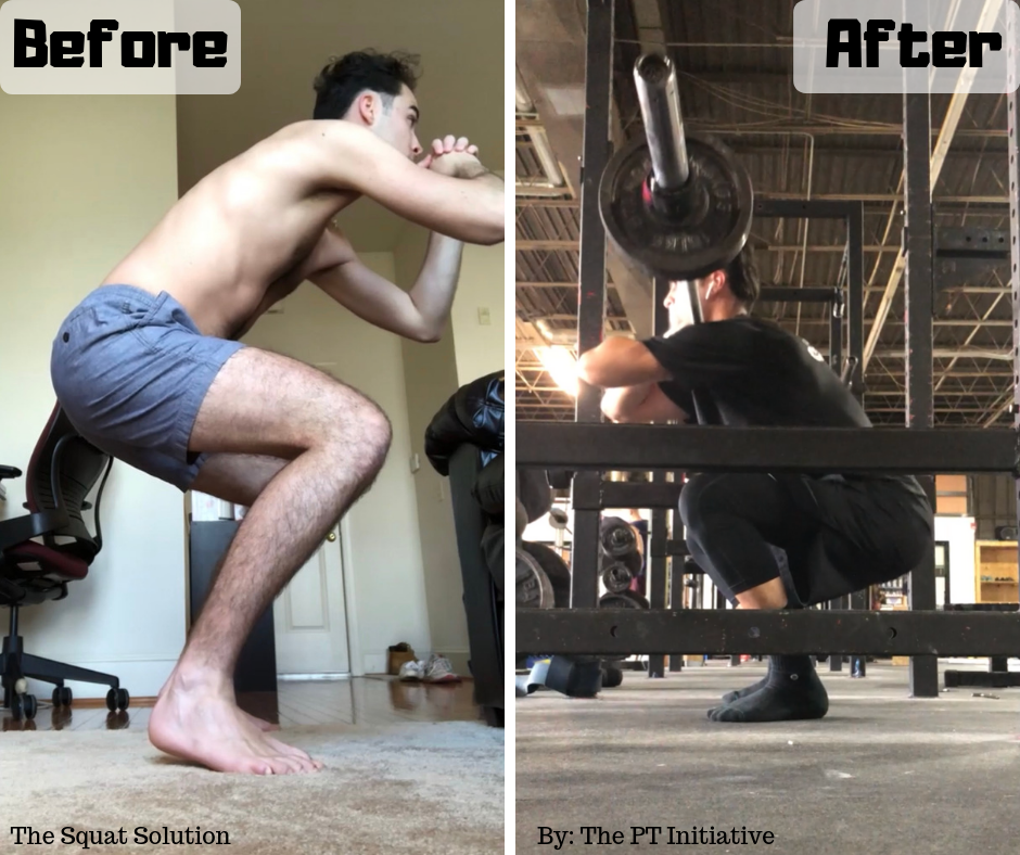 It was almost 2 years since Ryan had been able to walk into the gym and get a full workout in without leaving in more pain than he was before. The left photo was from the first time we began working together. At this stage he was kneeling down one leg at a time to pick things up due to pain with squatting down. We implemented the exact framework that The Squat Solution is built on, and the picture on the right shows where he was after a few months. Detailed assessments, hip screening, corrective exercise, mobility drills, and a research-driven plan are how we got here...and that's what I want to share with you today!